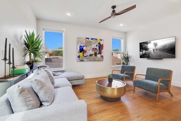 The open-concept living room offers comfortable seating and a streaming-ready smart TV with a sound bar. The fully stocked kitchen features new appliances and all the essentials for cooking meals or hosting a small gathering. The second floor includes a balcony with a bartop—perfect for morning coffee or evening cocktails. You’ll also enjoy an indoor/outdoor studio garage and lounge equipped with Cycloc bike mounts, a Park Tool repair stand, and an exterior bike wash station.