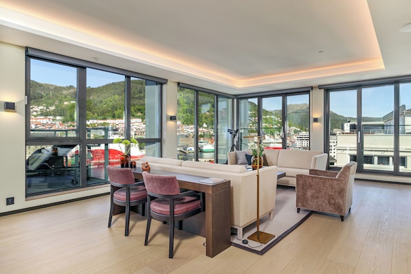 All main rooms have breathtaking views of Bergen's iconic harbor, where ships of all types gracefully glide across the water against a backdrop of majestic mountains.