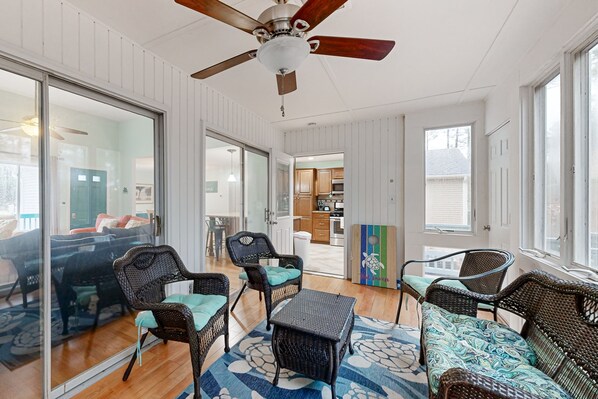 The bedrooms are all well-decorated with bright color palettes, sea-themed decor pieces, private TVs, and soft linens. Additionally, enjoy the spacious sunroom and central air-conditioning,