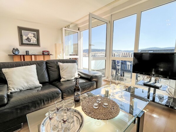 "Schwarzwaldblick IV", apt. di 5 locali 120 m2 su 2 piani. Arredamento funzionale: soggiorno/sala da pranzo con angolo pranzo. Uscita sul balcone. 1 camera con 1 letto doppio (1 x 180 cm, lunghezza 200 cm). Cucina (forno, lavastoviglie, 4 piastre cottura in vetroceramica, tostapane, bollitore elettrico, forno a microonde, macchina da caffè elettrica). WC separato. Piano superiore: 2 camere, ogni camera con 1 letto doppio (1 x 180 cm, lunghezza 200 cm). 1 camera con 1 x 2 letti a castello (90 cm, lunghezza 200 cm). Vasca/doccia/WC. Riscaldamento. Balcone. Mobili da balcone. A disposizione: seggiolone, lettino per bimbi. Internet (wifi). Parcheggio (2 Auto). Prego notare: appartamento per non fumatori. Allarme antifumo.