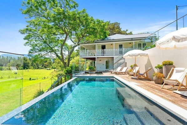 As you step inside, you're greeted by the warm embrace of polished timber hardwood floors that lead you through an enchanting journey. The spacious interior boasts a thoughtful layout, ensuring that every guest finds their own slice of paradise. Three bathrooms within the main residence provide convenience, while a separate pool house adjacent to an alfresco dining areas adds an extra layer of opulence. Picture yourself indulging in the oversized copper bathtub or refreshing under the open sky with the outdoor shower – an experience that transcends the ordinary.