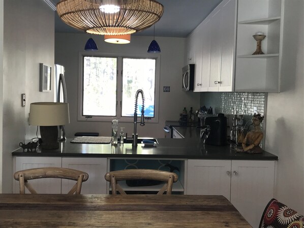 La cucina aggiornata dispone di elettrodomestici in acciaio inossidabile tra cui lavastoviglie e smaltimento dei rifiuti. C'è un forno a microonde, macchine per caffè e espresso. Piatti, stoviglie, bicchieri, pentole e padelle sono a vostra disposizione. C'è una lavatrice / asciugatrice in casa.