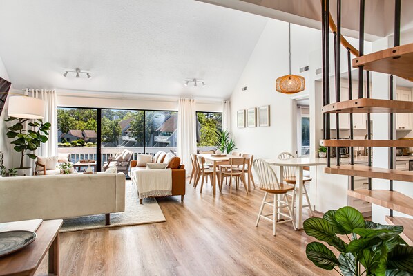 Inside, you'll find a bright interior filled with natural light, thanks to the floor-to-ceiling viewing windows. The interior has been completely updated in 2022 and is chic with gorgeous finishes, new appliances, and modern decor. Gather around the living area furniture to take in a movie night on the large TV or make memories around the dining table (extendable to fit eight people), playing board games or reading books provided for your enjoyment. Take advantage of the little work-from-home office nook equipped with a modern standing desk and lake views in case inspiration strikes. Prepare grand meals or on-the-go snacks in the fully equipped kitchen, complete with stainless steel appliances and extras such as a waffle maker, Crockpot, Keurig Coffee Maker, and filtered water dispenser. Follow the sweeping spiral staircase to the loft, where you'll find three comfortable beds (one convertible). The beautiful main bedroom is a sight to behold, with amazing views, a TV for private viewing, and a lovely en suite bathroom. Each downstairs bedroom comes with its own brand new flatscreen TV.