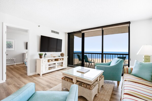 Overlook the surf and sand from the private balcony of this fifth floor 3-bedroom, 2-bath oceanfront condo! Just steps to Sea Colony's half-mile of private guarded beach, not to mention the community's oceanfront pools and fitness room, this single-level seaside getaway is home to a living and dining area, well-equipped kitchen, full hallway bathroom and two bedrooms, including the master suite. Central air conditioning, dryer and more. Accessible without stairs. 4 TVs, 3 DVDs, Blu-ray, Keurig, Wifi.