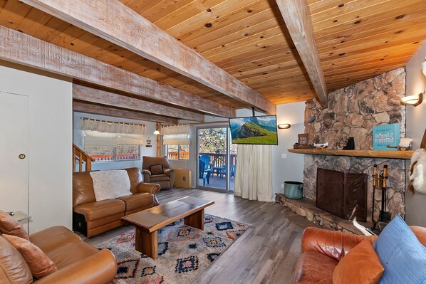 · Features: Wood burning fireplace, Flatscreen TV, and a Foosball table for entertainment. Enjoy cozy seating in a comfortable and inviting space.
