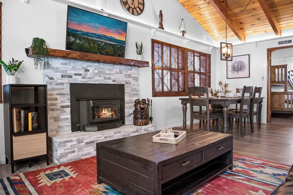 Relax and warm up beside a wood burning fireplace, chill on the sofa, read a book on one of the comfortable sitting chairs, or watch a movie on the Smart TV (Chromecast or AirPlay from your accounts on Netflix, Disney+, Hulu, Amazon Prime, YouTube and much more).