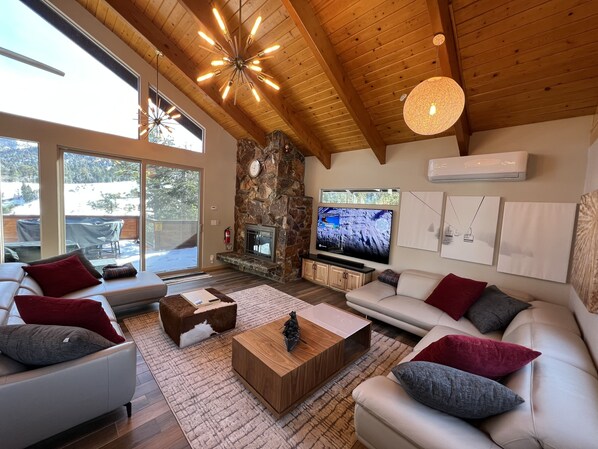 Escape with your family & friends to this fabulous 3 bedroom, 2.5 bath mountain modern chalet with all the amenities. 10-15 min walk to the base of Bear Mtn and steps away from the national forest. You'll enjoy spectacular views of Bear Mtn on a massive 1600 sq ft two story redwood deck. Relax after a long day of snow play in the large 7 person hot tub on the upper deck as you watch skiers and snowboarders on the slopes of Bear Mtn or zen out on the lower deck in a secluded 6 person cedar steam sauna and sweat out all those toxins from a night of bar hopping the village.