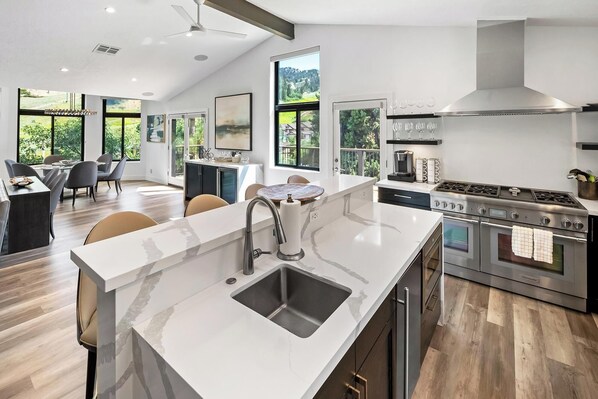 Bring the whole group together in the beautifully appointed kitchen and dining area. The fully stocked chef’s kitchen features quartz countertops, stainless steel appliances, and everything you need to prepare meals at home. Whether you’re cooking up a hearty mountain breakfast or a family dinner after a day on the slopes, this open-concept kitchen makes it easy to connect and entertain.