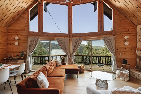 Living Room: The welcoming living room on the entry level features a plush sectional sofa, additional occasional chairs, and a large flatscreen TV for entertainment. A cozy gas fireplace adds warmth to the room, complemented by breathtaking views through the expansive floor-to-ceiling windows. Step out onto the spacious deck directly from here to enjoy an alfresco dining experience amidst stunning scenery.