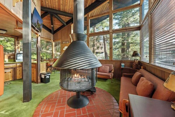 Fireplace- Round natural wood burning fireplace. We do not provide wood. It can be purchased upon filling our check in form to be delivered to the home. Please be mindful of any children and the fireplace. There is no protective barrier to prevent access to the fireplace