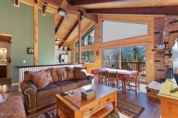 Relax by the fireplace and enjoy the expansive views through oversized windows. The open living room is equipped with a large digital TV and ready-to-use internet accounts for Netflix, Amazon Prime, and more.