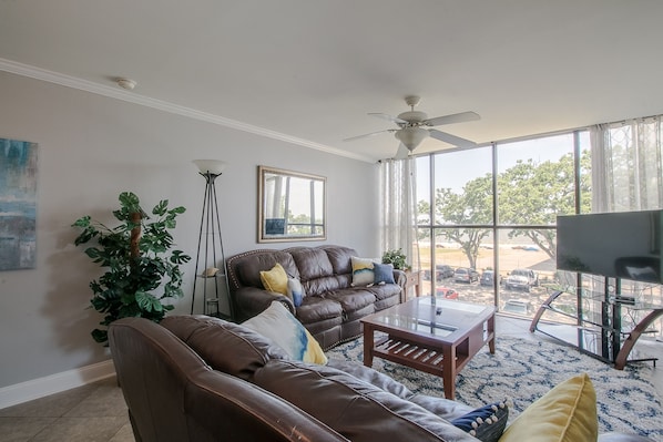 Le pareti sono il grigio più tenero con rifiniture bianche nitide. Il soggiorno ha un morbido tappeto blu e bianco in cui puoi affondare le dita dei piedi mentre guardi la TV da 50 pollici o scegli di perderti nella splendida vista sulla spiaggia. I dipinti e l'arte della parete riflettono tutti il tema rilassante della spiaggia.