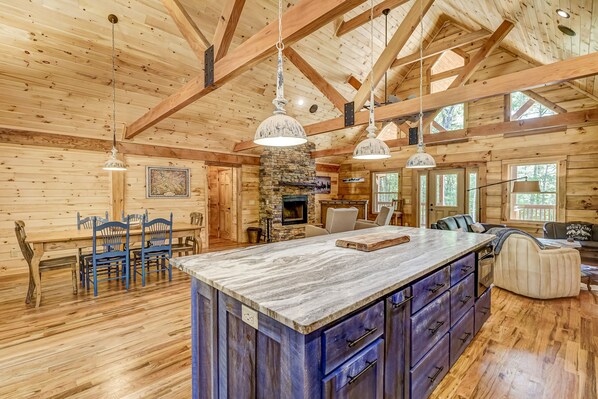 Inside, find vaulted ceilings, exposed wood beams, floor-to-ceiling windows, and wood accents throughout. The open floor plan seamlessly combines the living and dining areas and the kitchen. Read a favorite book or listen to music as you unwind by the wood fireplace or stream a favorite series on the smart TV with Roku in the living area. The open kitchen has been fully appointed with modern stainless steel appliances, including a French-door fridge, a Zline stove/oven, dishwasher, a built-in microwave, and coffee maker. There is even an island with counter seating for additional dining space. The adjoining dining table is perfect for more formal meals.