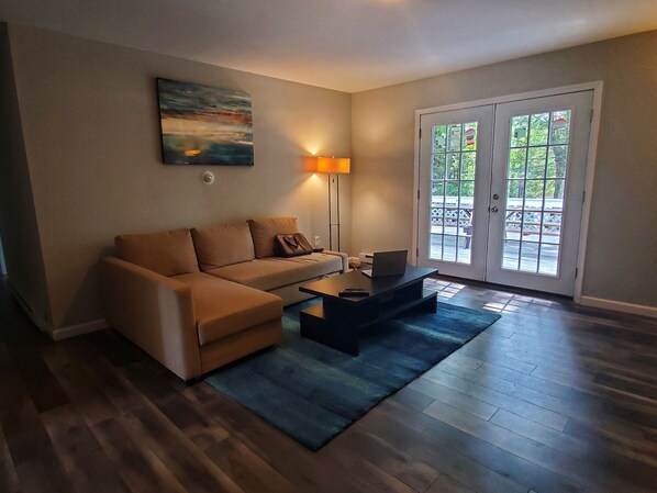 • Bar Stools, Coffee Table, Smart TV, Satellite Internet/WIFI, Dining Table, Chairs & Benches Decorative Fireplace, walk out to the Deck.