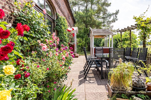 Questo appartamento per vacanze offre un'area esterna privata con barbecue. Ci sono anche un giardino e una terrazza all'aperto arredata, entrambi condivisi con il padrone di casa che vive nello stesso edificio. Proprio di fronte all'appartamento si trova una piccola area salotto separata dalla terrazza da un paravento.