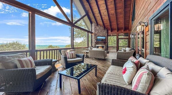 During the morning, while sipping your hot coffee or eating your breakfast, you can enjoy breathtaking views of mountains, trees, and the sunrise. There are multiple spaces on the decks to unwind. Plus, outside, you'll find a screened porch, a cozy swing bed, a wood-burning fireplace, a hot tub, and a gas grill - perfect for all your vacation needs!