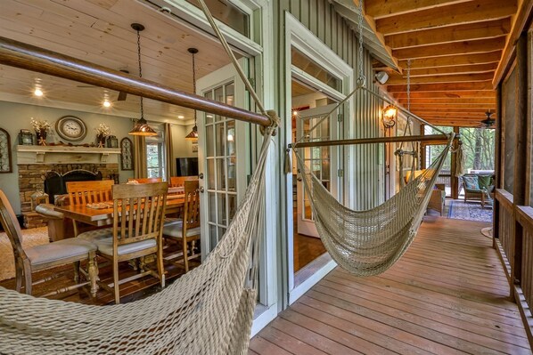 Non farti ingannare dal nome del cottage! Questa bellissima e unica proprietà ha tutte le sensazioni di un accogliente cottage sul fiume, ma ha molto spazio per il vostro gruppo. Situato sulle rive del fiume Coosawattee, si ha la sensazione di tornare indietro nel tempo mentre entri. Questa casa è modellata su un antico casale appalachiano con pareti bianche e grandi pavimenti in legno. Stai cercando di preparare un pasto gourmet? Questa cucina ha tutto ciò che il tuo chef può immaginare, da una torrefattore Nesco, doppio forno e un waffle belga. Con posti a sedere per 10, la cucina e la grande sala sono senza dubbio il cuore della casa. Apri le porte francesi per il grande portico schermato e lascia che i suoni del fiume ti bagnino. Dopo uno stomaco pieno, rilassati su una sedia sospesa, oppure passeggia sulla spiaggia privata situata proprio sul fiume e goditi l'amaca, l'area del focolare o semplicemente giocare nella sabbia. Quando la giornata volge al termine, goditi un film a livello di terrazza. Ogni camera è splendidamente decorata con una "T" con un arredamento morbido e romantico che dissolve rapidamente tutto lo stress. Questa cabina si trova in una comunità privata recintata a pochi minuti dal centro di Ellijay ea 15 minuti dal centro di Blue Ridge. Se stai cercando un cottage accogliente con un sacco di spazio per i ricordi da fare, Rivershire Cottage è la tua scelta migliore.