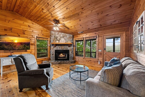 Family Room - 55” Smart TV, stacked stone gas fireplace, plush sofa, arm chair, area rug, coffee table, ceiling fan