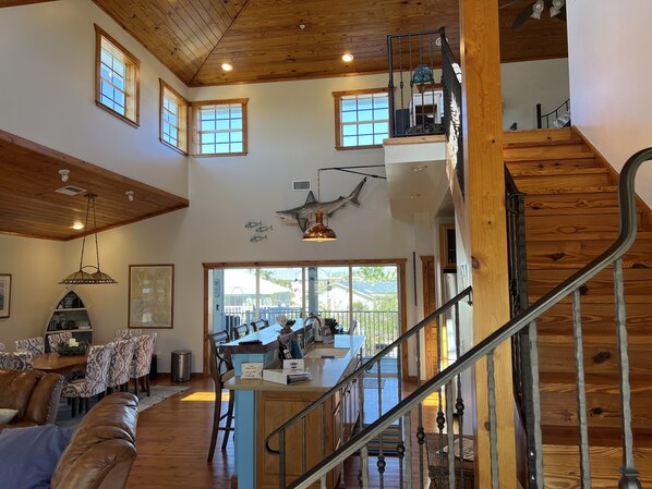Beautiful rod iron railing follows the staircase to the upstairs loft which is complete with a queen bed and a full bath. It also offers wonderful views of the waterway behind the house.