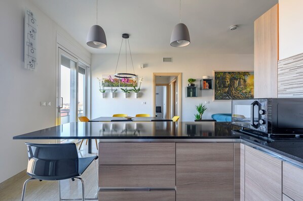 L’appartamento è composto da tre camere da letto, di cui una matrimoniale con letto king size, una matrimoniale con letto queen size e una doppia con due letti singoli. Ciascuna di esse dispone di comodi materassi, comodini, un armadio e una panca per i bagagli. Indipendentemente dal numero di ospiti indicati nella prenotazione, l’appartamento sarà sempre interamente disponibile per gli ospiti (non troverete stanze/bagni chiusi a chiave).