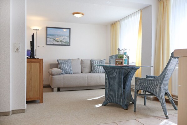 L'appartamento di 2 locali arredato in modo confortevole si trova nel seminterrato (seminterrato) di una casa per le vacanze con 8 unità vicino alla spiaggia. I 41 m² sono arredati con cura per 3 persone. Sarete accolti da un'accogliente zona giorno con cucina, tavolo da pranzo e divano e TV. La camera da letto separata ha un letto matrimoniale e un armadio per il vostro guardaroba vacanza. Il bagno con doccia ha una finestra con luce naturale. All'arrivo i tuoi letti sono già fatti e gli asciugamani sono pronti. Un parcheggio è disponibile di fronte alla casa gratuitamente. Gli animali domestici sono i benvenuti nell'appartamento a pagamento.
