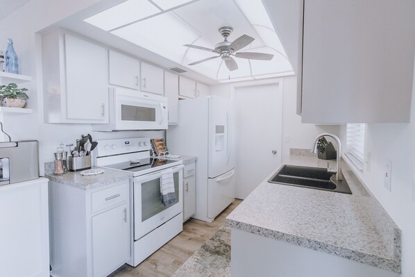》Fully stocked kitchen with wine glasses, wine opener, paper towels, trash bags, silverware, plates, bowls, cups, cookware, bakeware, etc!