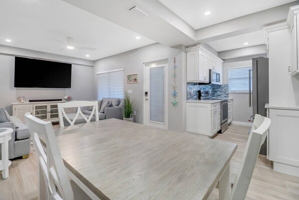 Open concept living space dispone di una zona giorno con divano letto queen size, grande Smart TV a parete con cavo, tavolo altezza pub e sedie, posti 4