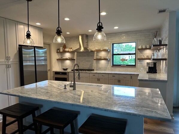 Our home away from home is an open plan 3 BR, 2 BA, split bedroom layout. A sun porch with additional daybed and lounge space opens to the screened private lanai with heated pool and spa surrounded by greenery. The sound of the waterfall by day, and the party lights at night, lend a resort feel. There is a large shelf in the pool for lounging, or for our littlest guests to enjoy. Inside, the home has been totally refreshed and refurnished into a relaxing escape for family and friends. The vaulted Great Room includes a spacious entry area, a newly-remodeled open kitchen with island seating for 4, a farm table with seating for 8+, and a living/lounging space open to the Sun Porch and lanai. The 65" TV in the Great Room is wired with internet and ready to stream your subscription services and the cabinet below is loaded with games, cards and puzzles. The leather sofa opens into a queen size sleeper.