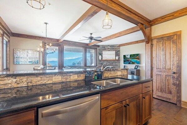 Description: Enjoy a beautiful view of the mountains from this rugged timber frame two-bedroom, two-bathroom downstairs condo (stair access only). The mountain view can be admired from the deck or the large picture windows in the open kitchen, dining room, and living room areas. This condo is beautifully decorated to compliment the custom upgrades. The kitchen features upgraded cabinetry, granite countertops, hardwood floors and stainless-steel appliances and it is fully equipped to prepare a meal. The living room has a vaulted ceiling, cultured stone gas fireplace, hardwood floors, comfortable and cozy furniture, as well as a TV. The deck is thoughtfully equipped to enjoy outdoor living and dining with a built-in gas grill. Enjoy a short mountain getaway to relax inside or breathe in the fresh mountain air from the deck. If time allows, book for an extended stay and explore all the High Country has to offer.