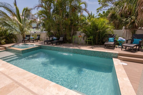 Spend your days soaking up the sun at your private heated pool and spa, surrounded by tropical landscaping. The covered lanai offers shade and plenty of lounge seating, while the outdoor bar sets the perfect backdrop for sunset cocktails or casual meals after a day at the beach. Enjoy grilling out on the BBQ grill and savoring dinner at the outdoor dining table on the balcony overlooking the pool. Whether you’re relaxing with family or entertaining friends, this inviting outdoor space brings everyone together for easy island living.