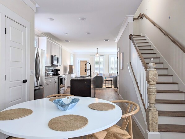 The kitchen is right next to the living room and is stocked with all new appliances, small appliances like a crockpot, toaster and blender, and ore than enough dishes, glassware, flatware, etc for 4 people! A large island leaves plenty of room for prep work if you decide to cook while you're here.