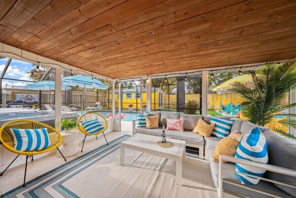 This isn't just a place to sleep — it's a full-on family adventure! Whether you're cannonballing into the heated pool, putting for par on the 3-hole mini golf course, or lighting up the night with an outdoor movie under the stars, this home brings FUN to your Florida getaway.