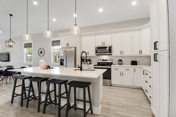 The fully renovated kitchen boasts a stunning new backsplash and cabinetry, paired with stainless steel appliances designed to handle hearty group and family meals. The dining area comfortably seats six, perfect for sharing delicious home-cooked dinners or quick breakfasts before heading out to explore. After a day under the Florida sun, unwind in the living room with your favorite shows or movies on the smart TV, creating a cozy space to relax and recharge.