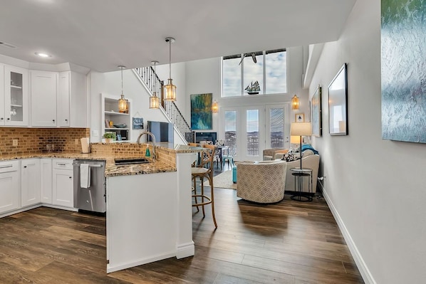 This is the only condo that has a game room! Your family will love playing the arcade game, some foosball, or simply lounging in the extra space. This condo has vaulted ceilings and updated finishes throughout! It is a walk-in unit with elevator access. There is one expansive King bedroom on the main level. A spacious master bedroom and bath, game room, and bunk room are on the upper level. There is beautiful wood flooring throughout the condo. This penthouse condo spoils you with a view 5 stories up! The large PRIVATE deck off the main living area is the perfect place to lounge with a lake view! The large windows allow a fantastic lake view and natural light to flow throughout this open-concept unit. The fully equipped kitchen has beautiful granite countertops, stainless steel appliances, a microwave, stove, oven, refrigerator, dishwasher, island, and the perfect touch of comfort from the brick backsplash.