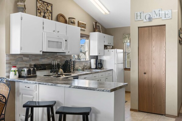 Stepping indoors, you’re met by bright, welcoming spaces lovingly furnished to maximize your downtime and connectivity with others. Sink into plush sofa seating in the living room while you surf the channels or queue up a movie on the TV. The fully equipped kitchen is ready to host all your mealtime endeavors, whether whipping up delicious homecooked creations or simply unpacking takeout from a local restaurant. Snag a high-top stool at the counter for snacks and light meals or gather around the dining table with formal seating for 4.