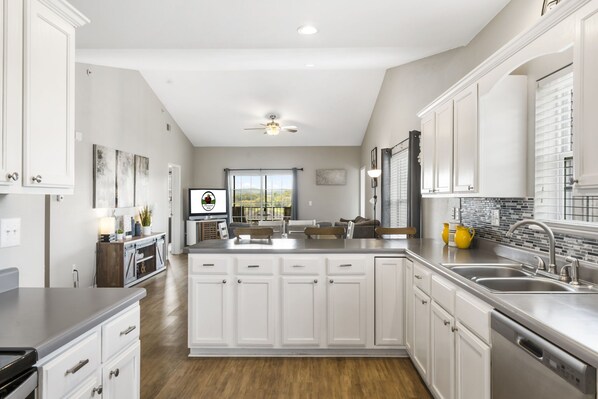 Modern comfort for the family with a gorgeous view in the heart of central Branson! This three-bedroom condo for up to six offers a lovely view of the property from a private, covered balcony. An open great room includes a full kitchen, a dining area, and a comfortable living room with cable TV/DVD. Two of the three bedrooms provides a king-size bed, closet and/or drawer space, cable TV, and a private bathroom. The master suite also features a king-size bed and a jetted tub in its spacious bedroom and bathroom. Guests can enjoy the convenience of an in-unit washer and dryer and free wireless internet. Seasonal outdoor pool access is included.