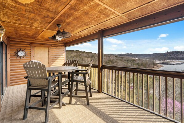 Private Covered Deck: Screened, High Table, 4 Chairs, Ceiling Fan, Carpet, Lake View. Private Side Deck (off Dining): Ceiling Fan