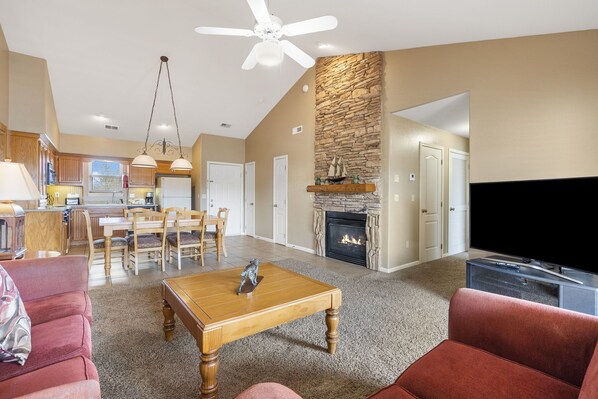 The one-bedroom condo features a king-size bed, jetted tub, fireplace, full kitchen, and dining area. It provides a lovely and comfortable stay for Branson travelers seeking a quieter area to rest from the hustle and bustle of Downtown. The spacious living area is perfect for lounging and relaxing, while the full kitchen is equipped with everything you need to prepare meals during your stay.