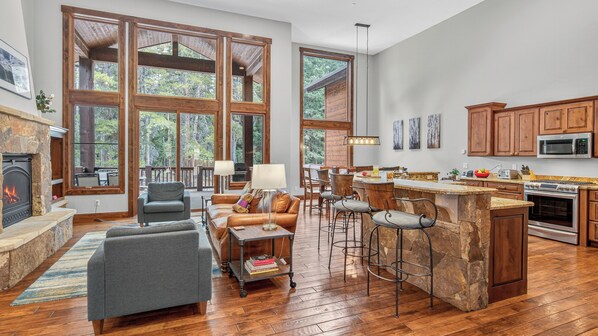 Upon entering the Whispering Pines duplex, you’ll discover a beautiful and open main level with large windows and high ceilings – the sliding doors open to an expansive deck with outdoor seating in the summer months and a BBQ gas grill. Back inside, your group will be able to spread out in the open floor plan that combines the kitchen, living area, and dining area – the spacious kitchen features a gas stove, ample workspace, and a large island with bar seating. The adjacent dining area offers seating for eight at the table. After dinner, retreat to the living area and enjoy a nice fire in the gas fireplace and a movie on the flat-screen TV.