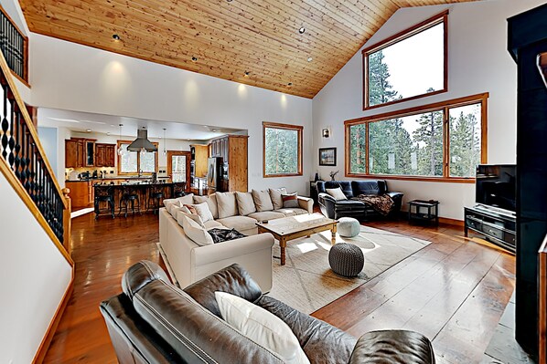 Ceilings soar in the Great Room, detailed with huge windows and a stately gas fireplace. Stretch out on the sectional, armchair, or sofa and watch shows on a 65” smart TV. Peruse a collection of games and enjoy family game night around the coffee table. Gourmands will appreciate the immaculate kitchen, fitted with high-end appliances including a Wolf gas stove, double oven, and dishwasher, as well as a huge island with seating for five. Gather for hearty meals at the seven-seat dining room table. Step out to the deck and enjoy the fresh mountain air. Sip a beverage while unwinding on comfortable lounge furniture. Make use of the charcoal grill to prepare tasty barbecue meals.