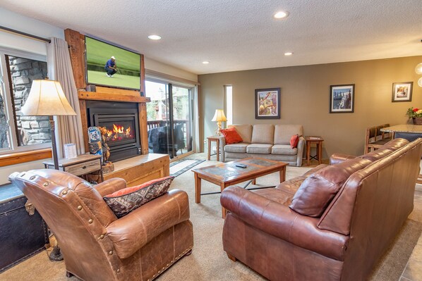 Inside you’ll find a cozy living area with comfortable leather furniture, a gas fireplace, and a large flat-screen TV. The bar separating the living area and the kitchen is a perfect place to congregate while you enjoy your favorite TV show or the morning snow report. Large sliding glass doors provide plenty of natural light and lead to the patio that has nice seating to enjoy the cool mountain air.