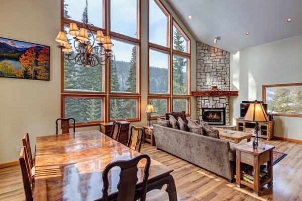 Down one level from the master bedroom you will find the kitchen, dining and living spaces, as well as two bedrooms and a bathroom. The vaulted ceilings and large picture windows on this main level create an open, bright feel. The expansive mountain views are beautiful.
