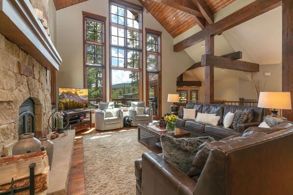 The living area is inviting and spacious, with soaring vaulted ceilings and warm natural light flooding in through floor-to-ceiling windows. There’s plenty of luxurious seating for relaxing and enjoying the wood fireplace and large flat-screen TV, as well as sweeping views of Breckenridge and the surrounding mountains. Just off the living area is a standalone office with a large desk/work area. And you can step out onto the deck with an outdoor dining set and a gas grill for barbequing while taking in the majesty of the mountains.