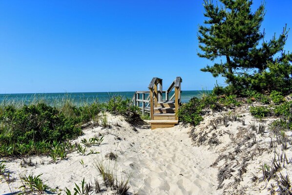 We spent a week here and really enjoyed the house and location. The house is located on a quiet street, tucked back in the trees which provided privacy. The view of the pond out back from the deck was fantastic. There is also a covered side deck great for dinners outside. The property was clean on arrival, and while there are clearly a few things it looks like they are planning on updating it was still in great shape. There is a stair chair which was kind of a pain to get large suitcases around but really that slight inconvenience was worth the location and I'm sure it is there for a reason. The neighborhood beach is a short maybe 4 minute walk away and was never crowded. The central air was amazing as well!!
