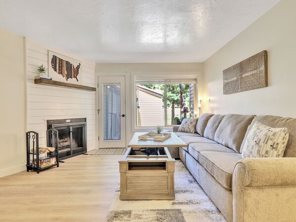 Living Area: Relax on the plush sectional sofa, warm up by the wood-burning fireplace, and enjoy your favorite shows on the smart TV. The living area also features a cozy bunk bed, perfect for extra sleeping space for families or groups.