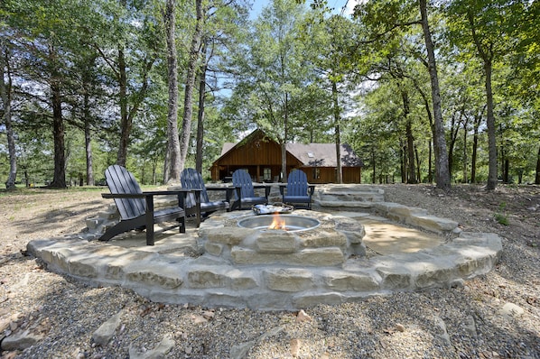 Step out the back door to a large covered deck—the perfect spot for morning coffee while taking in crisp mountain air. Evenings call for a soak in the brand-new six-person hot tub or a stroll down the rock-paved path to the creekside fire pit, ideal for roasting marshmallows under the stars. If the weather brings you inside, curl up by the rustic gas-burning fireplace in the living room and enjoy a cozy night in.