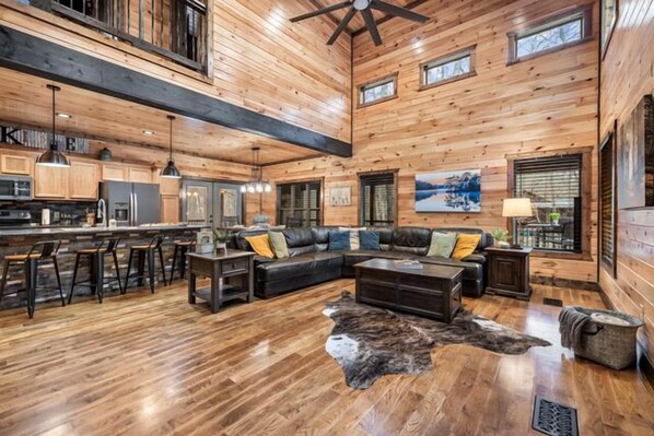 • Ambiance: Sink into the plush leather sectional sofa with a soft throw, warmed by the custom gas log fireplace in winter months. Step out on the covered deck and enjoy your company and nature. Open floor plan with plenty of space to mingle or find a quiet corner to reflect.