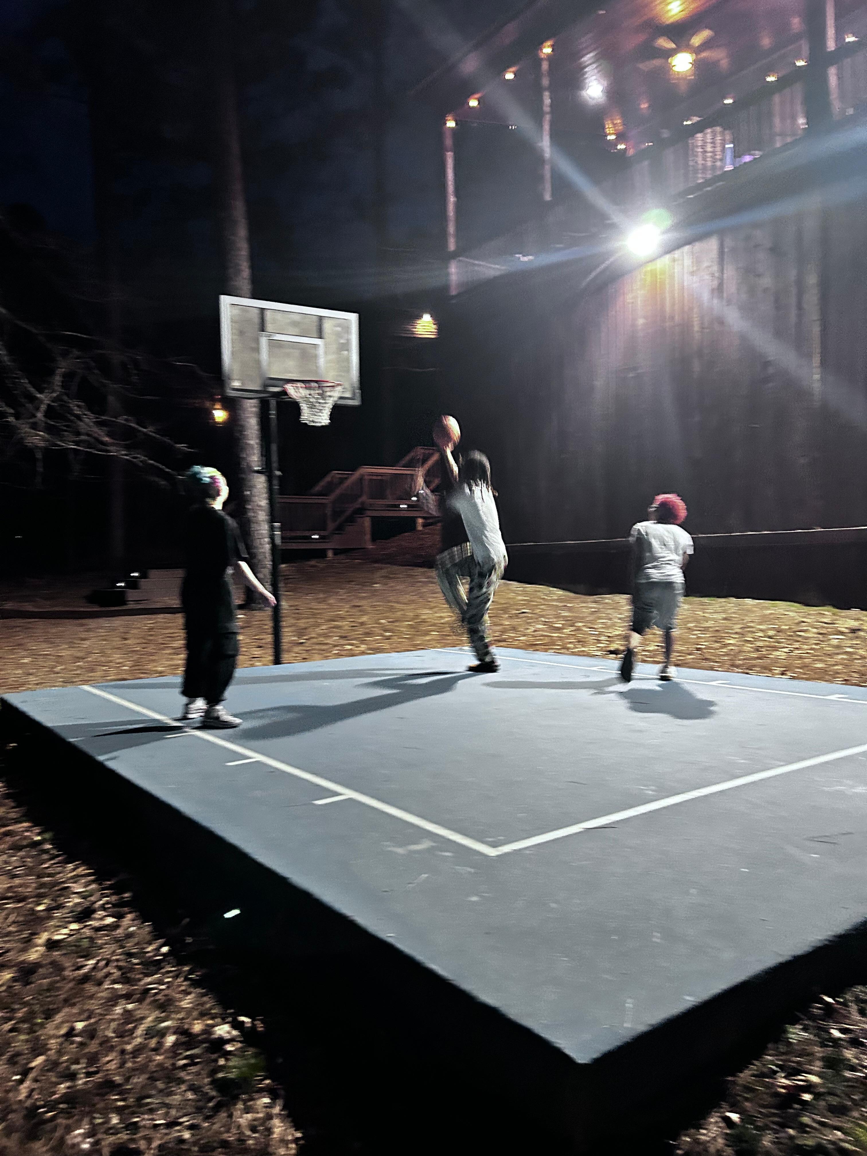 - Entertainment for all with a half basketball court, outdoor fire pit with Adirondack seating, a large playset, mini cabin and other outdoor games.