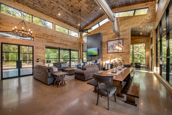 The living spaces of this cabin feature high vaulted ceilings and walls of windows allowing you to enjoy natures' beauty at all times.