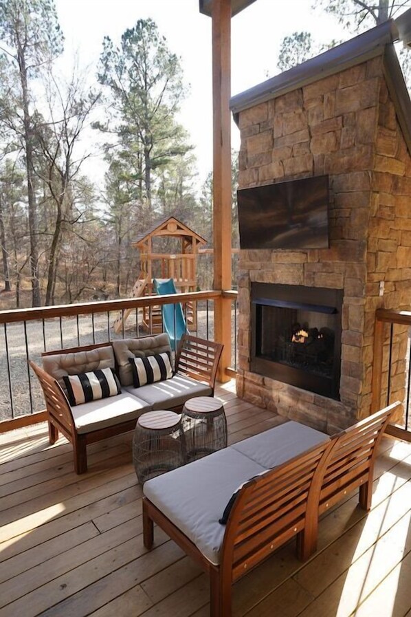 Catch a moment of solitude on the wrap-around porch and take in the scenery. Sip a cup of coffee while sitting on the front porch. Or watch the kids play on the play set from the cozy seating area on the back porch while enjoying a glass of wine at the end of a relaxing day. The back porch also includes a gas fireplace, propane grill, television and a hot tub for six.